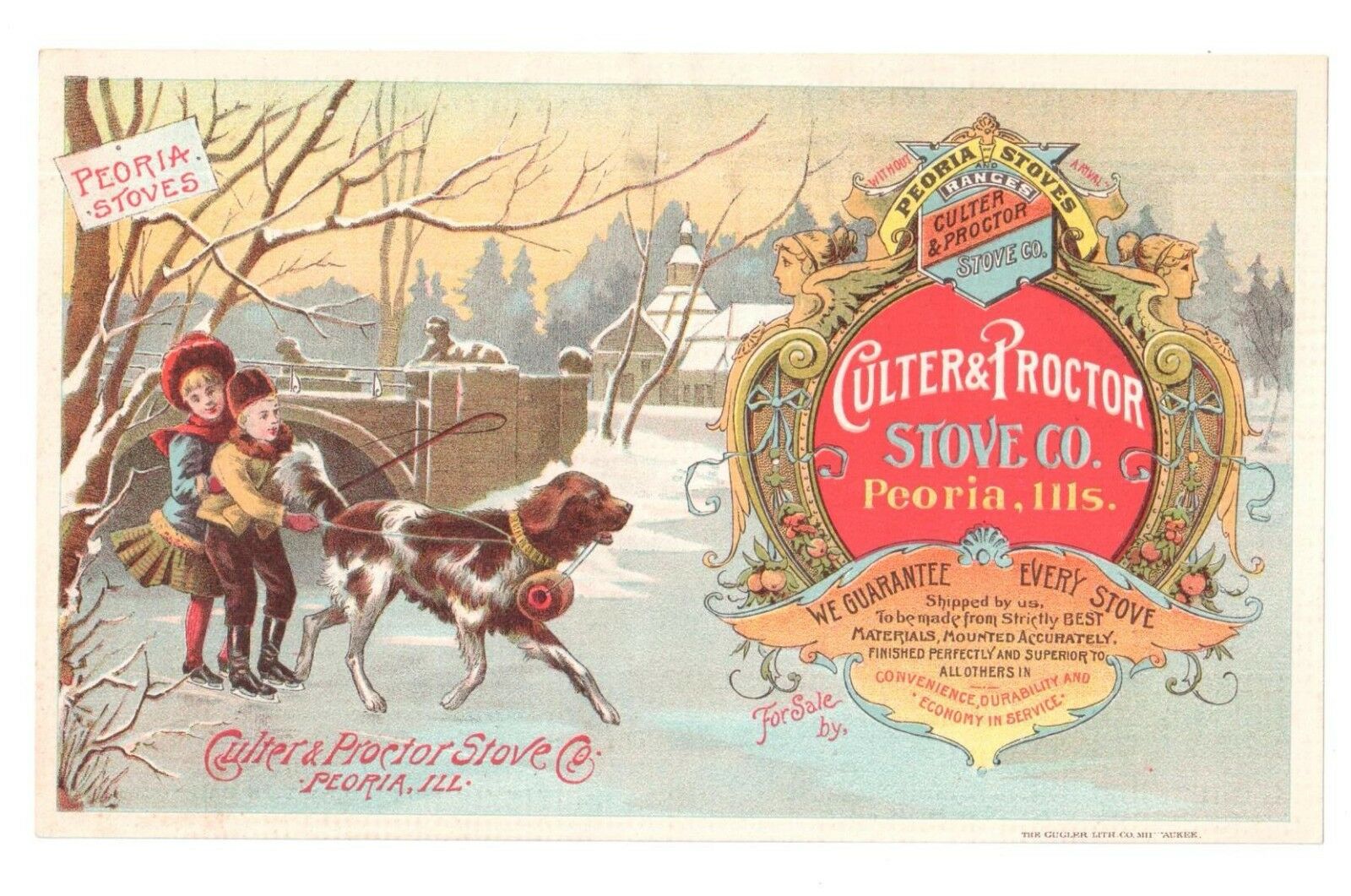 Title (ebay affiliate link): ANTIQUE PAPER AD STOVE CO., PEORIA, ILLINOIS DOG PULLS KIDS ON ICE SKATES!
