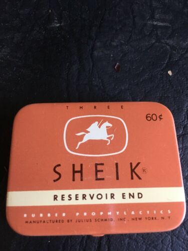 Title (ebay affiliate link): Vintage SHEIK CONDOM Prophylactics TIN FULL ORIGINAL CONTENTS Julius Schmid NY !