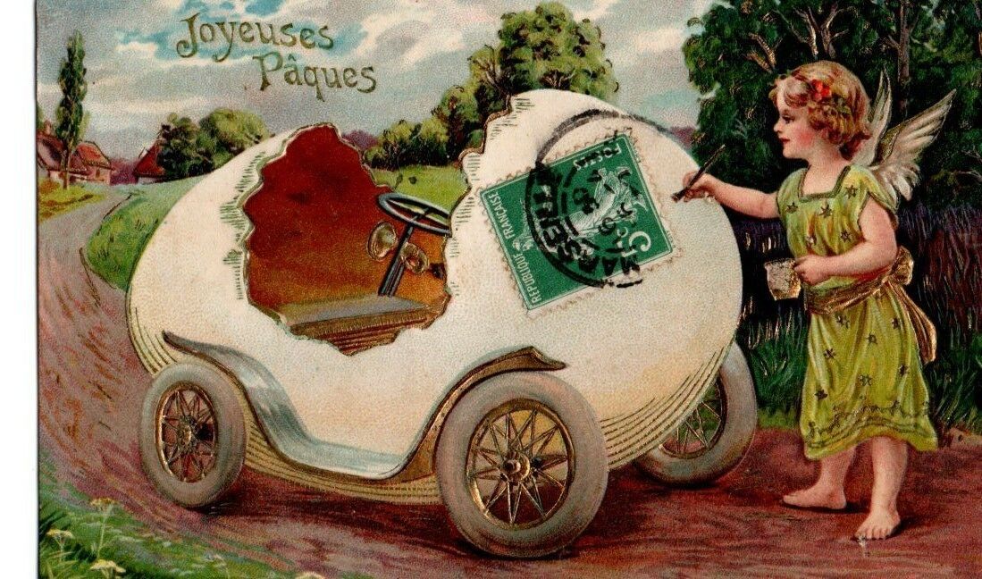 Title (ebay affiliate link): VINTAGE FRENCH EASTER GREETING postcard: FAIRY WITH EGG SHELL CAR
