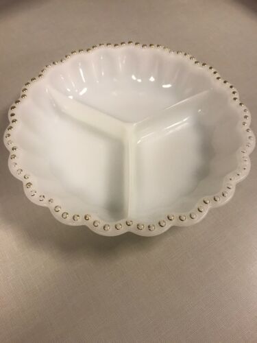 VINTAGE MILK GLASS TRI-DIVIDED DISH w/ GOLD ACCENTS