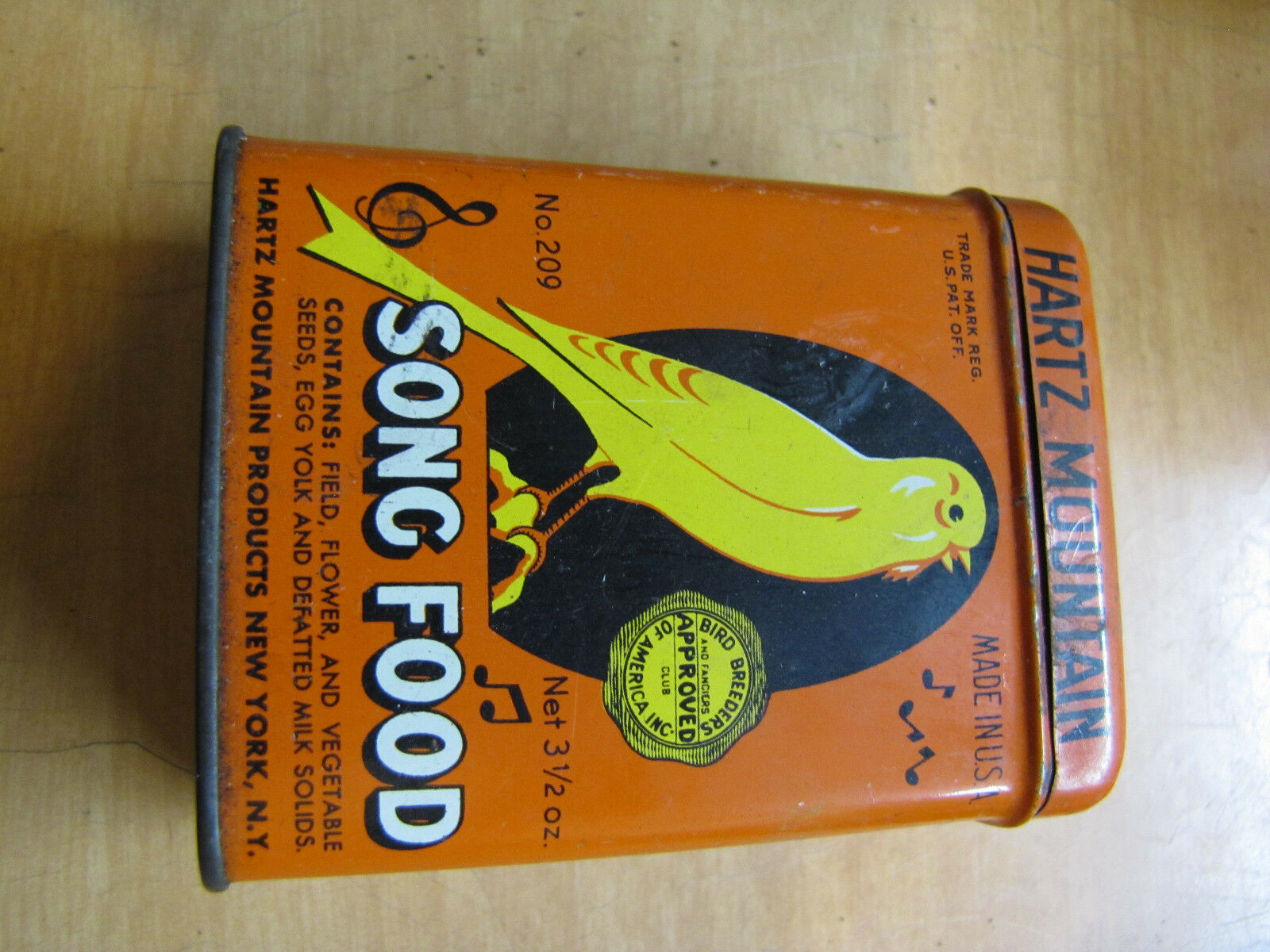 Title (ebay affiliate link): Vintage Hartz Mountain Canary Song Food ORANGE Tin w BOOKLET OFFER ON LID