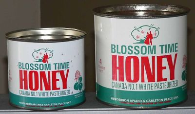 2 Nice graphic BLOSSOM TIME honey tin cans – Ontario