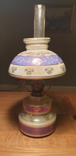 Title (ebay affiliate link): VINTAGE OIL LAMP WITH BLUE AND WHITE WITH GOLD GILT & CLEAR GLASS CHIMNEY.