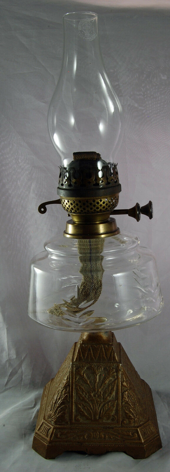 Title (ebay affiliate link): Oil Lamp with Cast Iron Base & Patterned Glass Reservoir - Duplex Burner