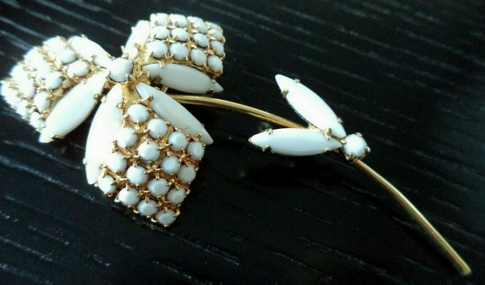 Title (ebay affiliate link): VINTAGE ESTATE JULIANA D&E MILK GLASS RHINESTONE FLOWER 3 1/4" BROOCH!!! G445L