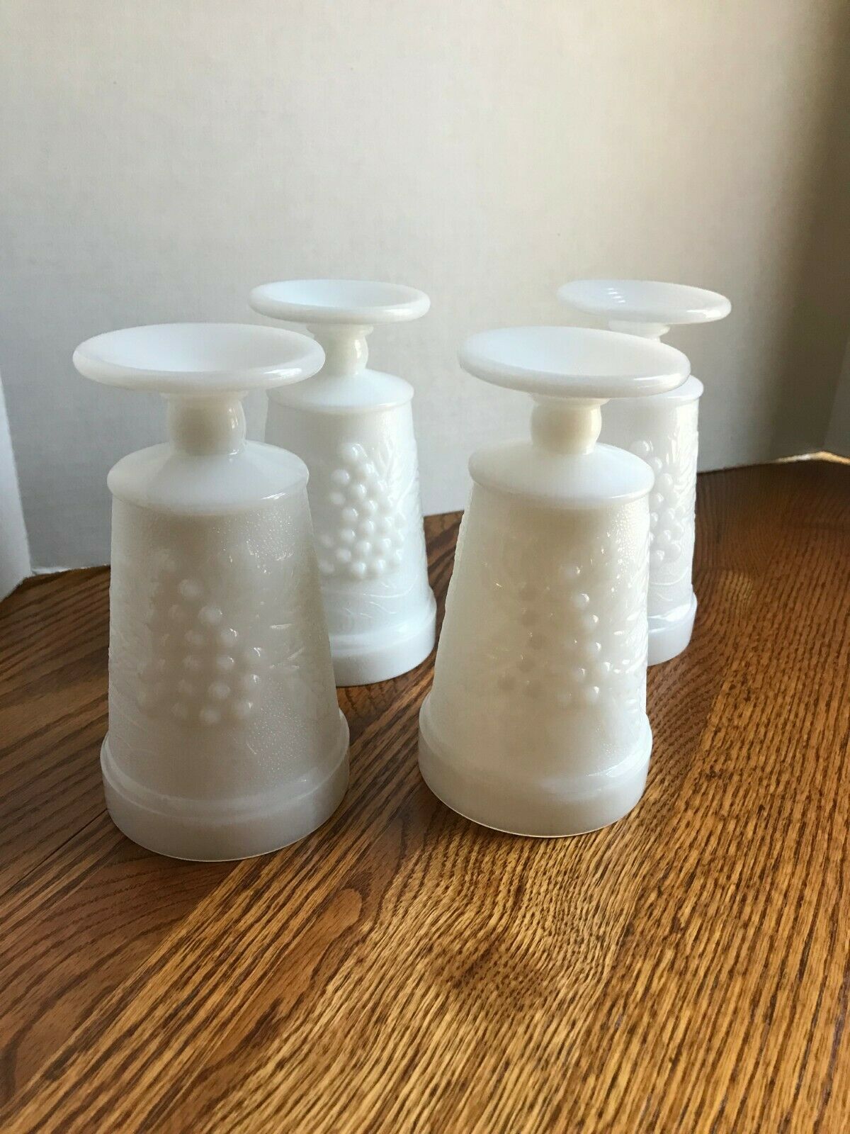 Title (ebay affiliate link): Vintage White Milk Glass Short Stem Goblet, Set of 4, Grapes Leaves