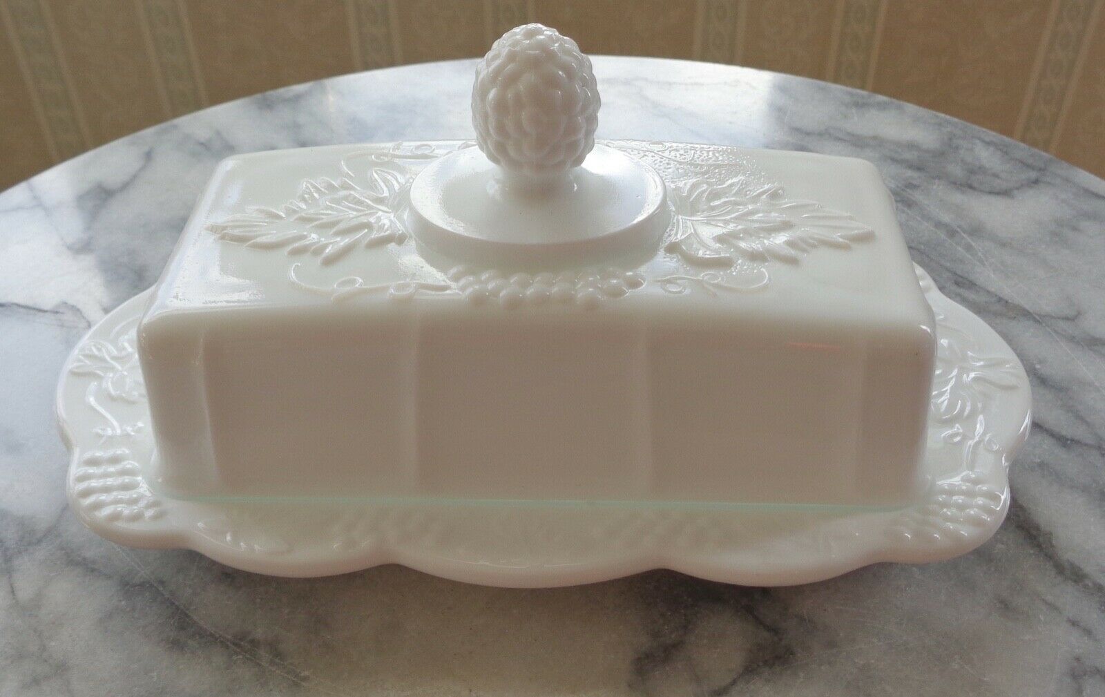 Vintage Milk Glass Grape Pattern Covered Butter Dish