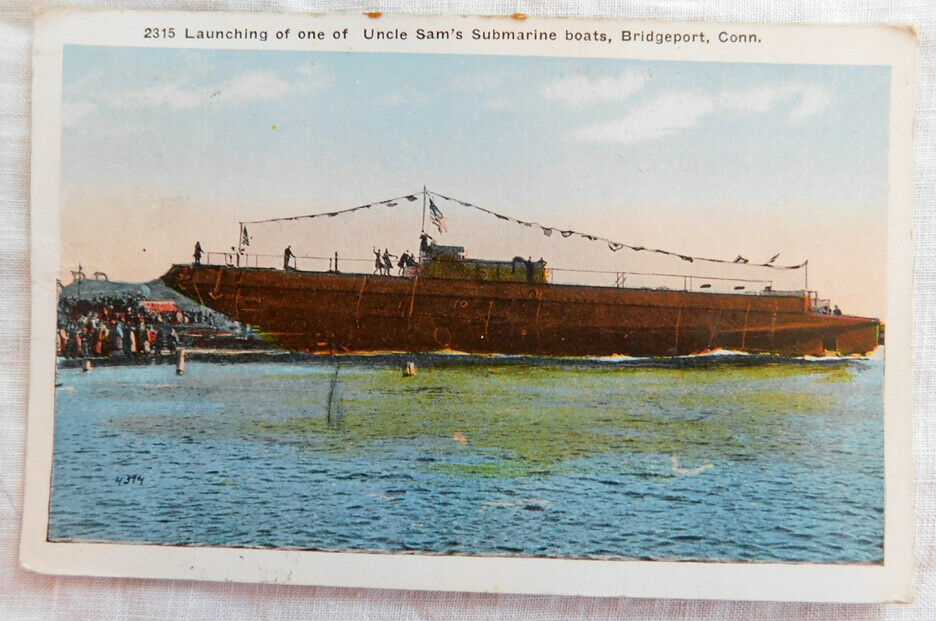 Title (ebay affiliate link): "Launching of one of Uncle Sam''s Submarines", Bridgport, Conn. "Postmarked 1916