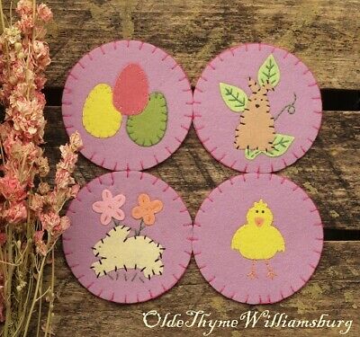 Primitive Stitchery EASTER Eggs Rabbits Chick Flowers Penny Rug ~ Candle Mat