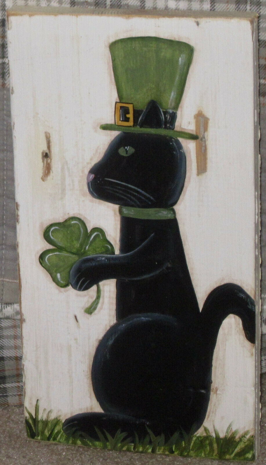 *~*PRIMITIVE*~* HP FOLK ART PRIM ST. PATRICK''S DAY BLACK CAT *~* RECLAIMED WOOD