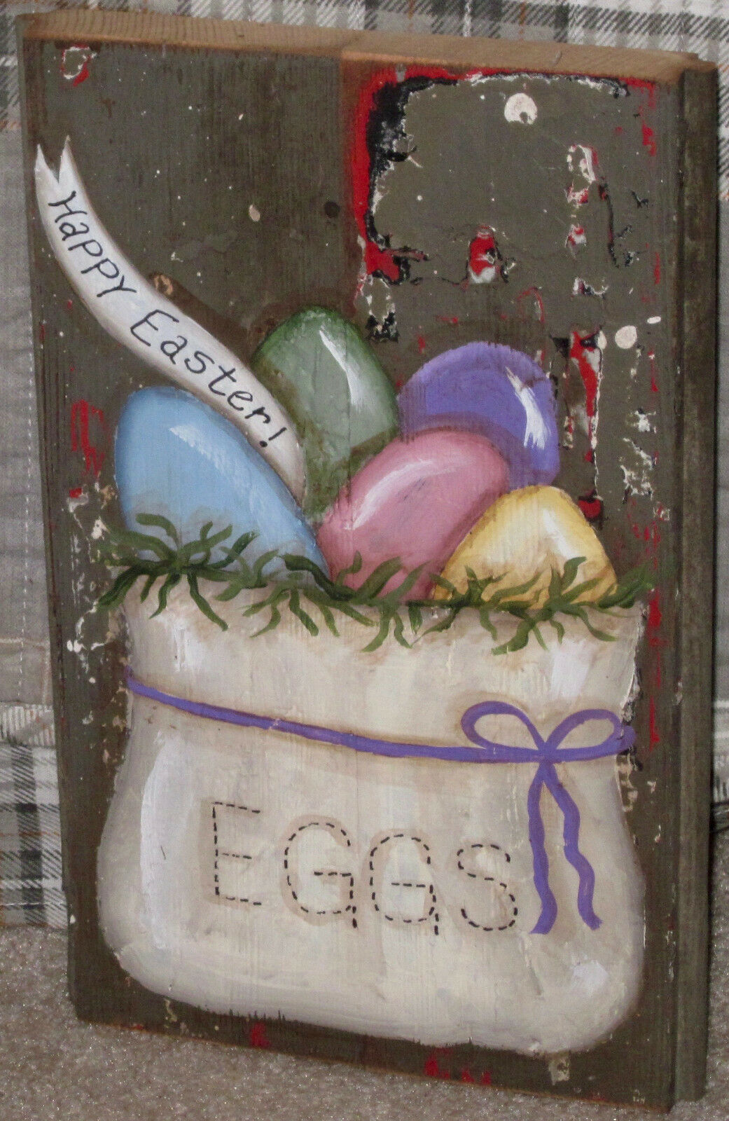 Title (ebay affiliate link): *~*PRIMITIVE*~* HP FOLK ART SACK OF COLORED EGGS *~* EASTER *~* RECLAIMED WOOD