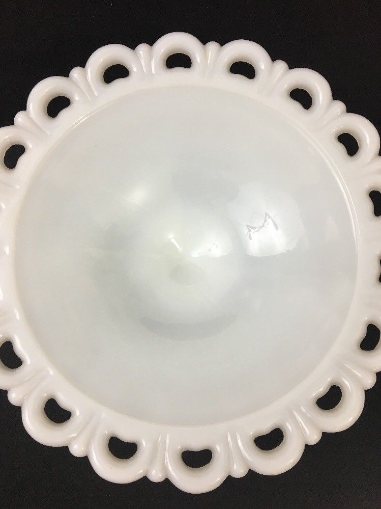 Title (ebay affiliate link): Anchor Hocking Milk Glass Lace Edge Pedestal Compote Bowl Large Repaired 11"