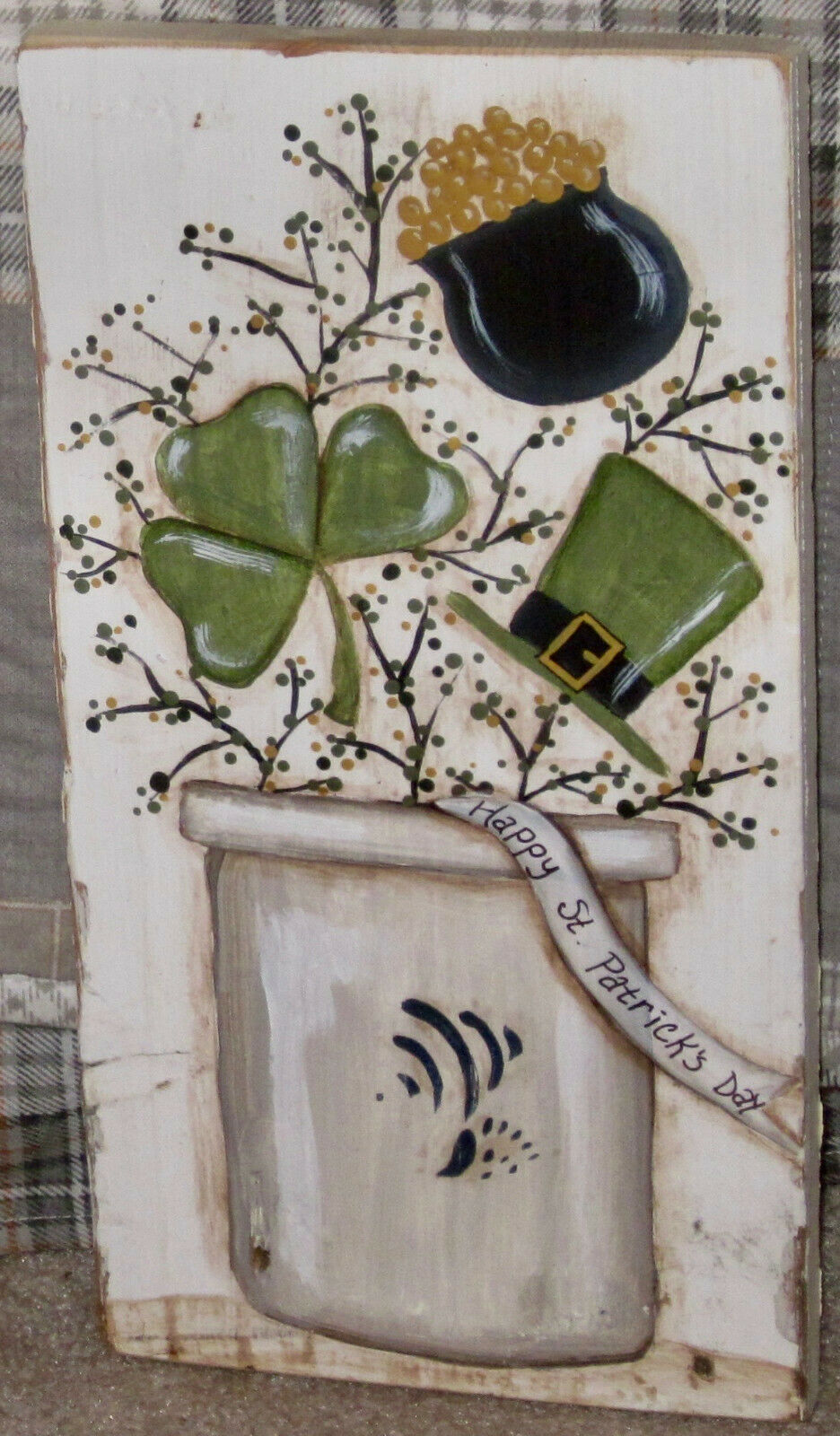 Title (ebay affiliate link): *~*PRIMITIVE*~* HP FOLK ART CROCK * SHAMROCK * POT OF GOLD *~* RECLAIMED WOOD