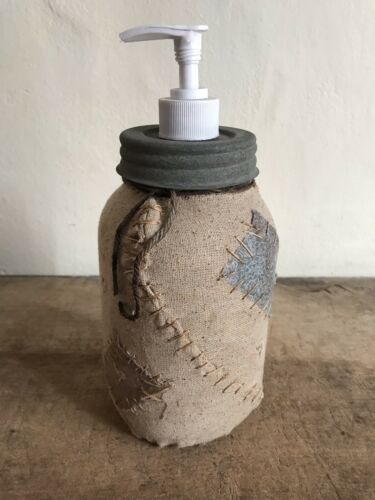 Primitive Country Farmhouse Soap Pump Mason Jar Dispenser Muslin Patched Textile