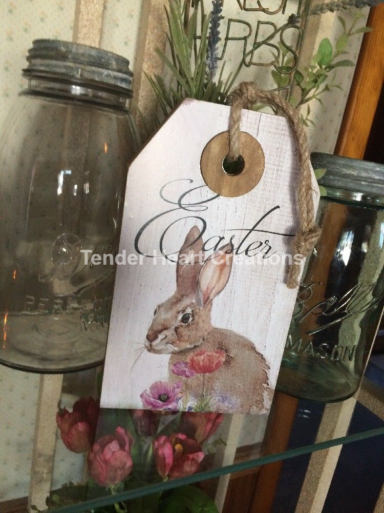 Title (ebay affiliate link): PRIMITIVE WOOD SIGN~"EASTER"~Rabbit/Bunny/Flower Shelf Sitter Wall Hanging Jute