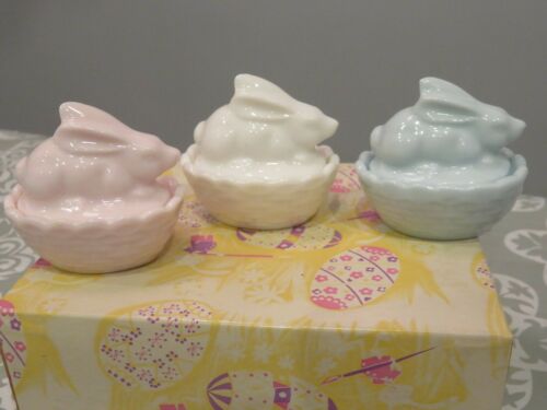 3 Vintage Milk Glass Easter Rabbit''s Sitting on a Basket White/Blue /Pink