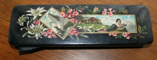 Antique Lacquered Papier Mache Swiss Glove Box - Alpine Cabin with Girl & Alps