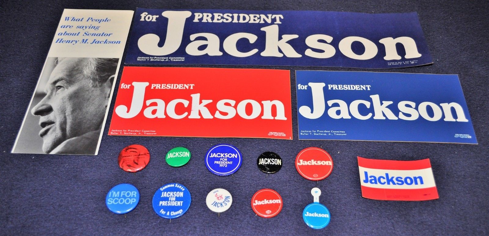 Title (ebay affiliate link): 9 Vintage 1972-76 "Scoop" Jackson Political Campaign Pinback Buttons &4 Stickers