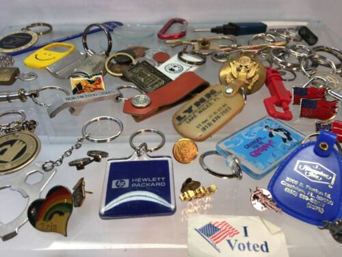 Title (ebay affiliate link): Vintage Junk Drawer Lot Pins Buttons Military tokens tack keychain ribbons A312