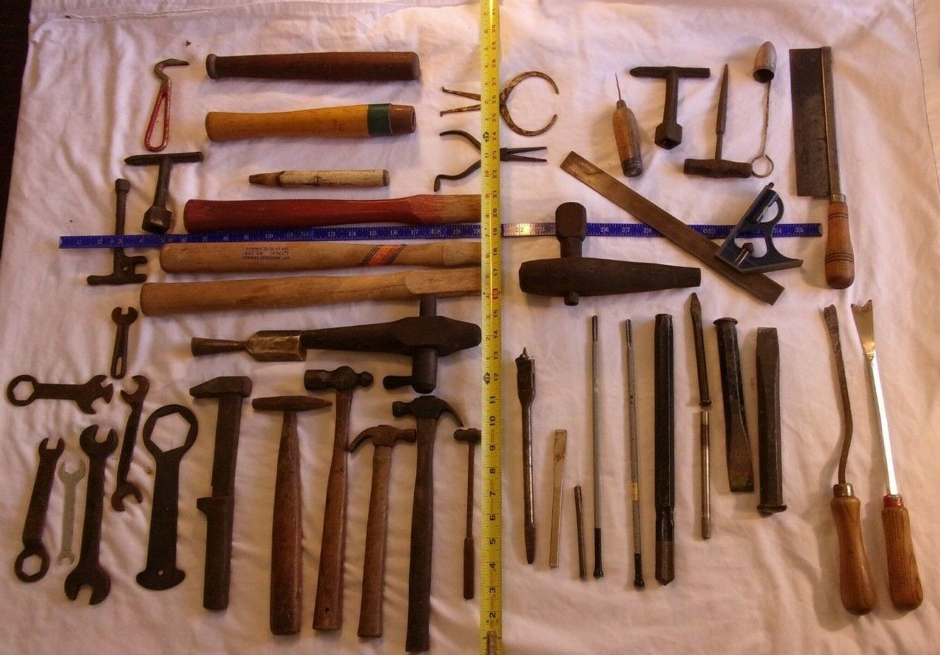 54 Vintage pieces - hammers, wrenches, handles, spikes, saw, spigots, misc.
