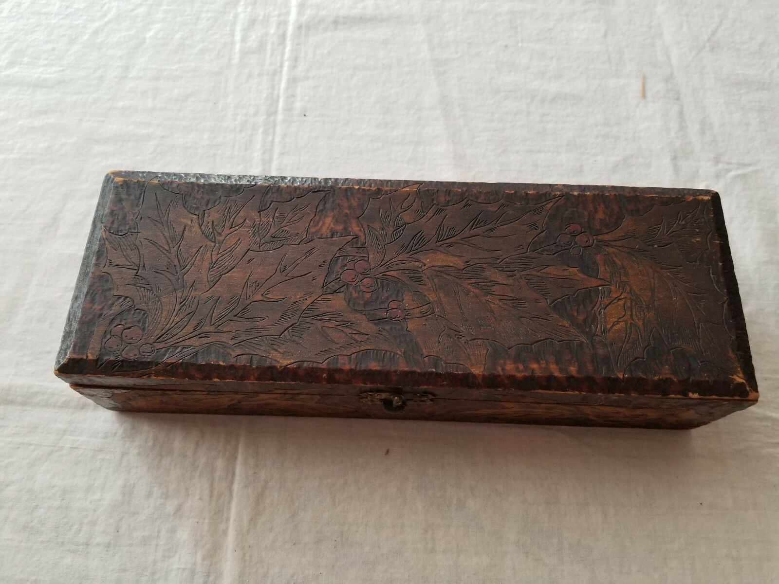 Title (ebay affiliate link): ANTIQUE FLEMISH ART PYROGRAPHY FLORAL DESIGN WOOD TRINKET GLOVES BOX