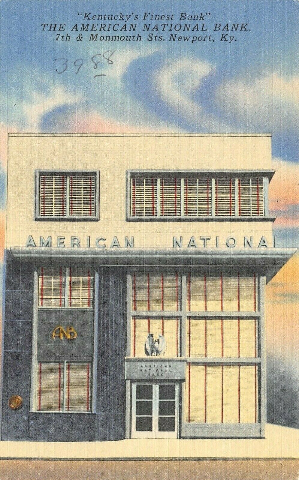 Title (ebay affiliate link): Newport Kentucky~Eagle Over Art Deco American National (Now Heritage) Bank~Linen