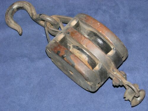 Antique Block and Tackle Pulley Wood Cast Iron with Hook 11" by 3 1/4" with Star