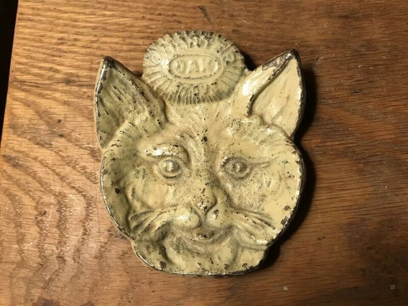 Antique Charter Oak Wood Stove Cast Iron Cat Head Mascot Spoon Rest Emblem
