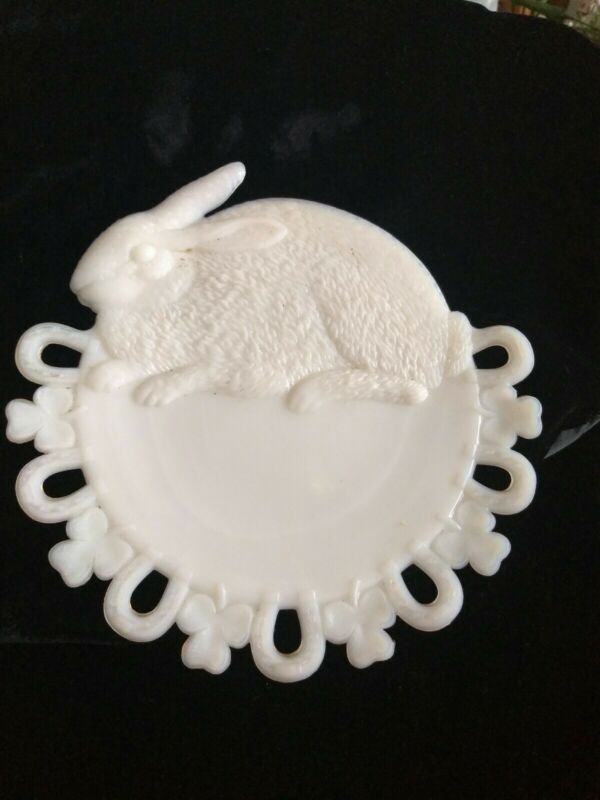 Title (ebay affiliate link): ANTIQUE MILK GLASS EASTER BUNNY SHAMROCKS HORSESHOES PLATE WESTMORELAND TOO CUTE