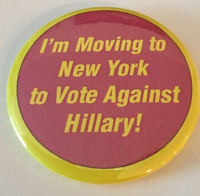 Title (ebay affiliate link): 2 1/2" Anti-Hillary "I''m Moving to New York To Vote Against Hillary!" Pin