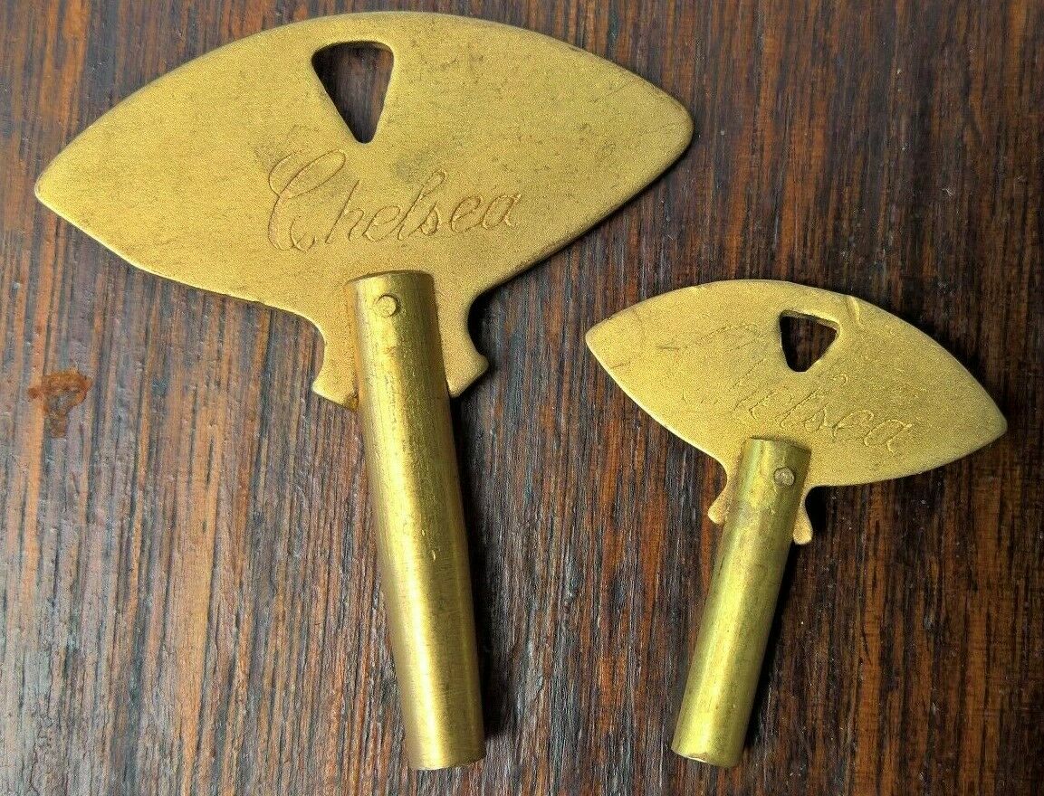 Title (ebay affiliate link): 2 x VINTAGE ORIGINAL CHELSEA BRASS WINDING CLOCK SHIPS BELL CLOCK KEYS #5 & #3!