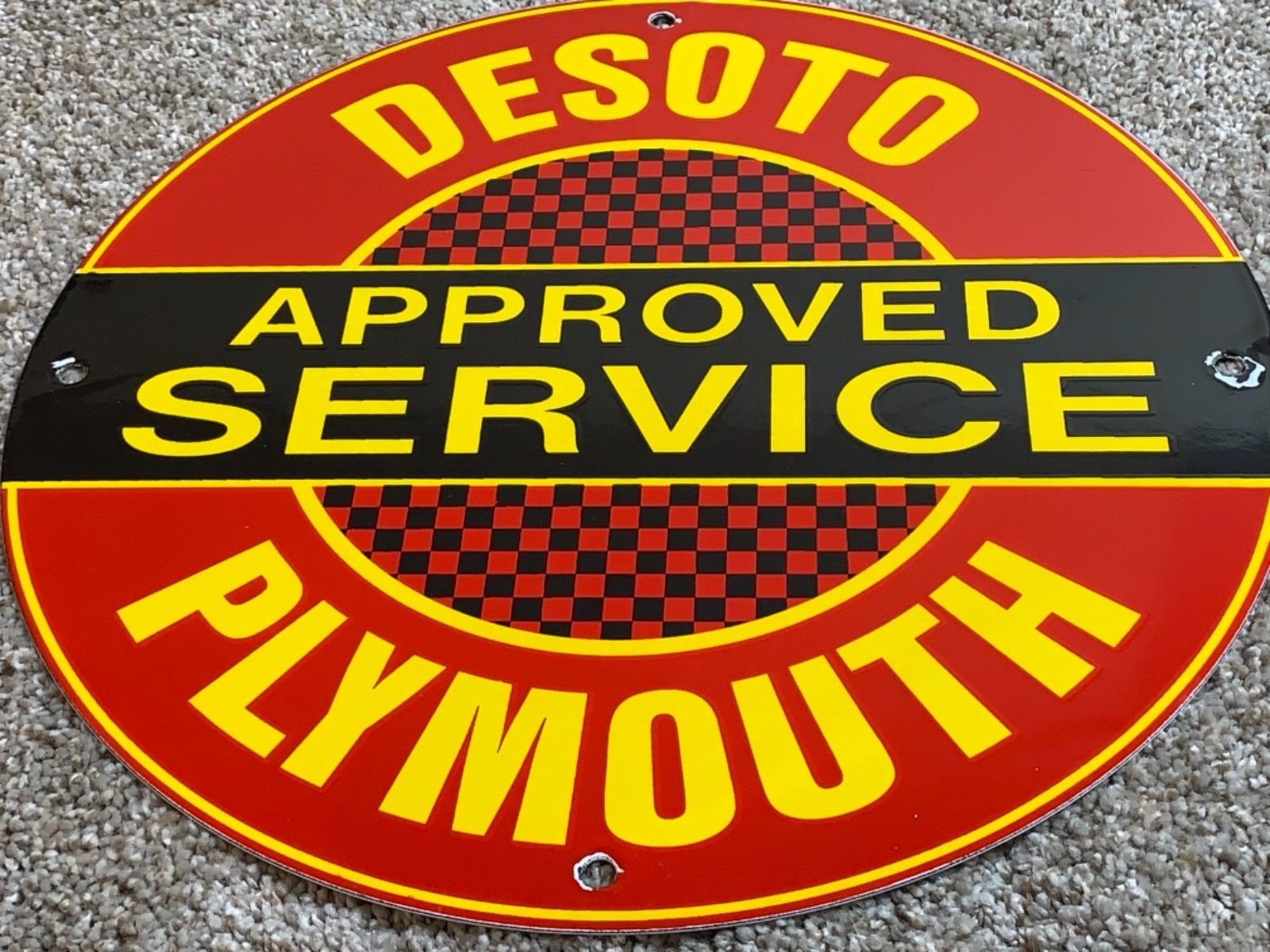 VINTAGE DESOTO PLYMOUTH CAR DEALERSHIP PORCELAIN ENAMEL SIGN 11 3/4 GAS OIL NOS