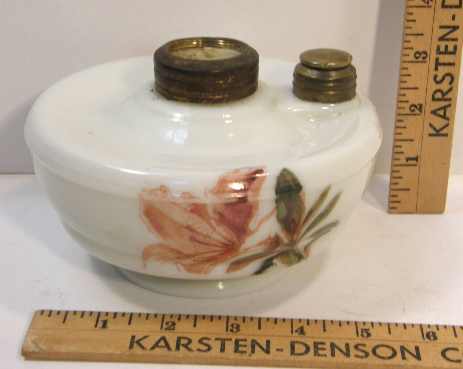 ANTIQUE MILK GLASS OIL LAMP FONT HANGING BRACKET HAND PAINTED PINK LILY FLOWER