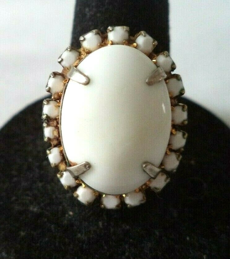 Title (ebay affiliate link): STUNNING VINTAGE ESTATE JULIANA D&E MILK GLASS RHINESTONE ADJUSTABLE RING! G455V