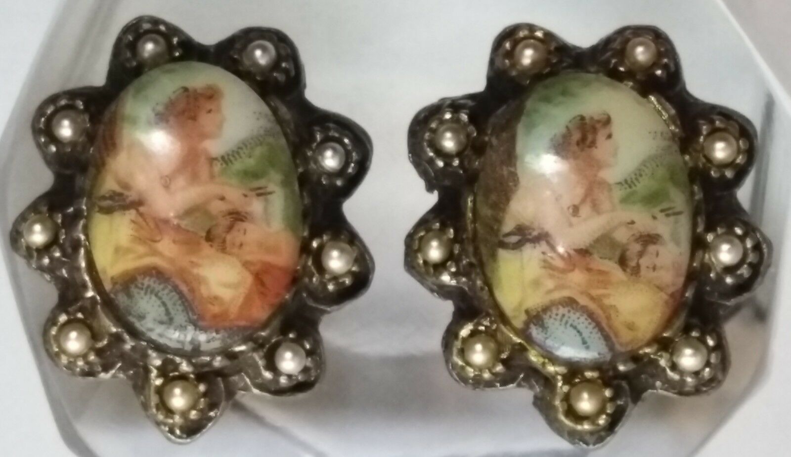 Title (ebay affiliate link): 1" Vintage Silver toned Painted Milk Glass Faux Pearl Clip Earrings Unsigned