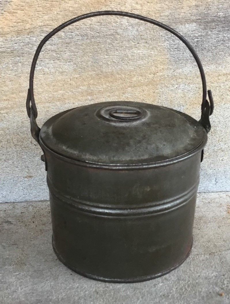 Title (ebay affiliate link): Antique Primitive Tinware Tin Bail Handle Bucket w Lid Grease Pail