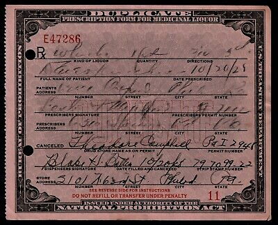 Title (ebay affiliate link): Prohibition Whiskey Booze Prescription Old Doctor Pharmacy Bar PA Rx 1928 Blake