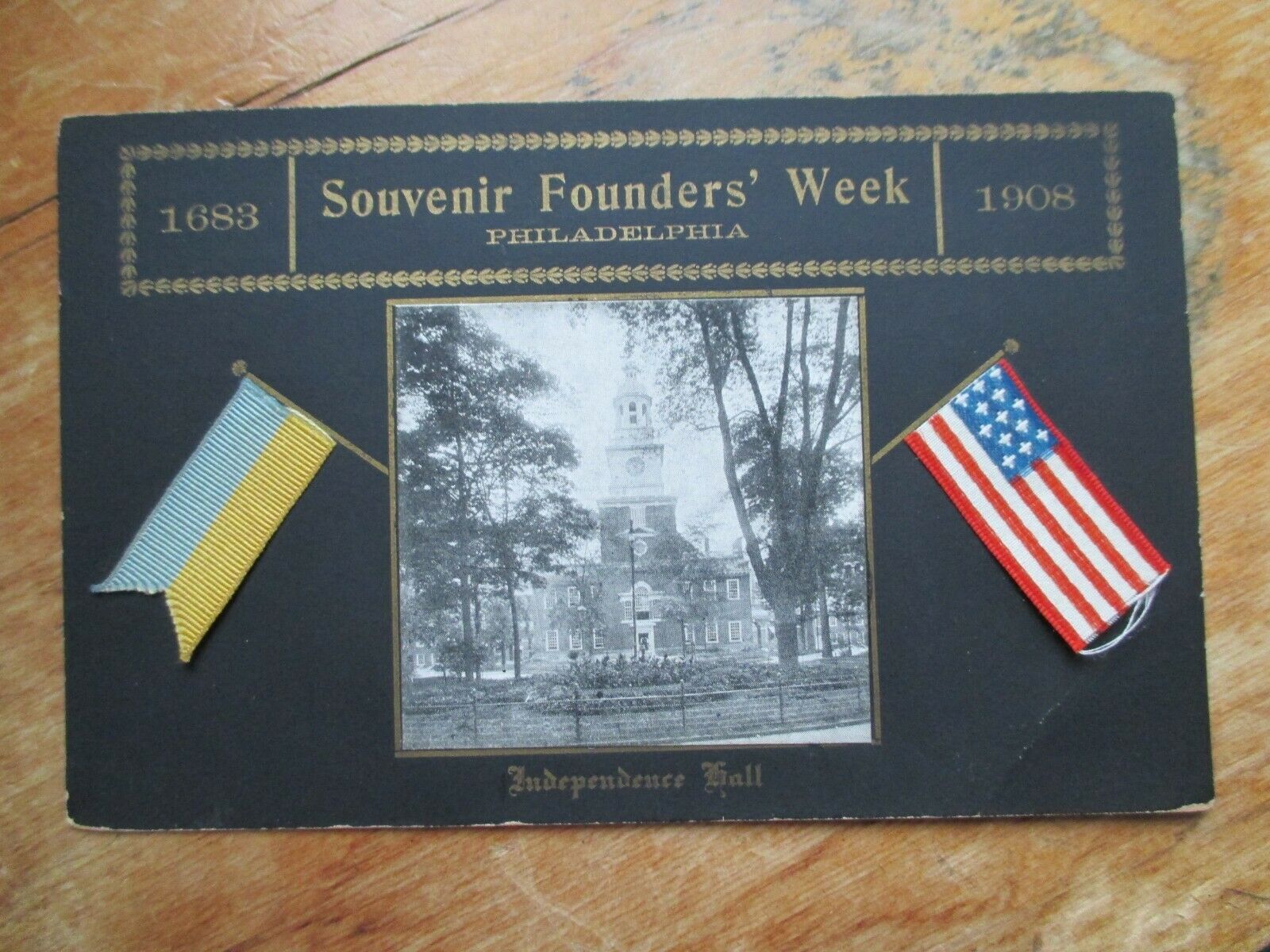Vintage 1908 Unused Souvenir Postcard w/Cloth Flags Philadelphia PA Founders Wk.