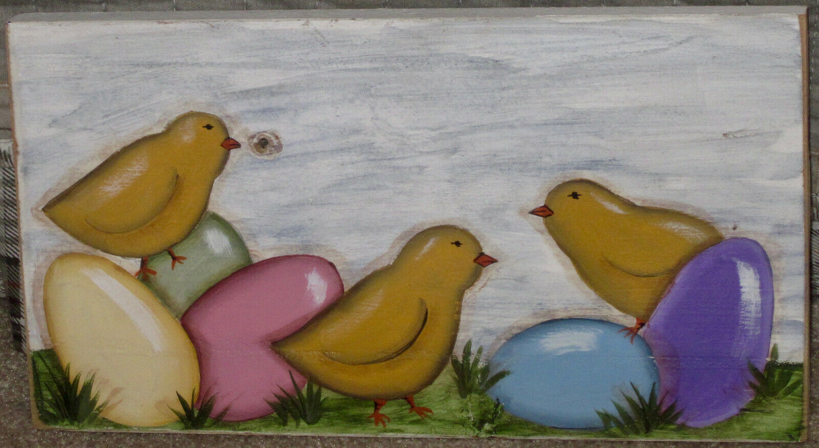 Title (ebay affiliate link): *~*PRIMITIVE*~* HP FOLK ART PRIM CHICKS *~* COLORED EGGS *~* RECLAIMED WOOD