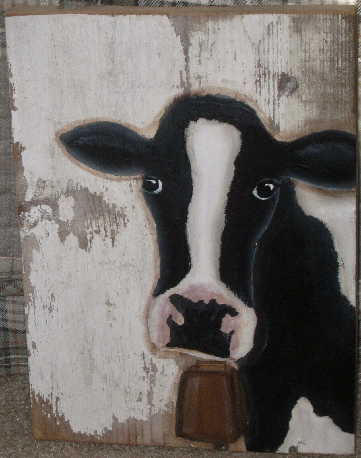 Title (ebay affiliate link): *~*PRIMITIVE*~* HP FOLK ART PRIM BLACK AND WHITE COW *~* OLD RECLAIMED WOOD