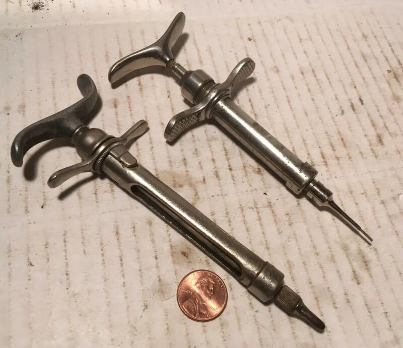 Title (ebay affiliate link): Pair Antique Metal & Glass Medical Syringes Instruments Different