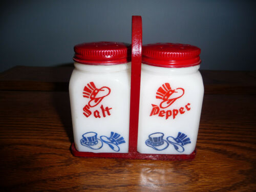 Title (ebay affiliate link): VINTAGE TIPP?? SALT PEPPER TOP HATS MILK GLASS RED LIDS AND STAND USA MADE
