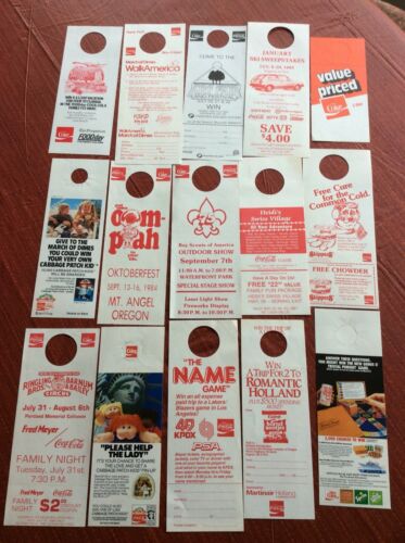 Title (ebay affiliate link): Coca Cola Lot of Bottle Neck Hangers assorted promotions Cabbage Patch kids etc.