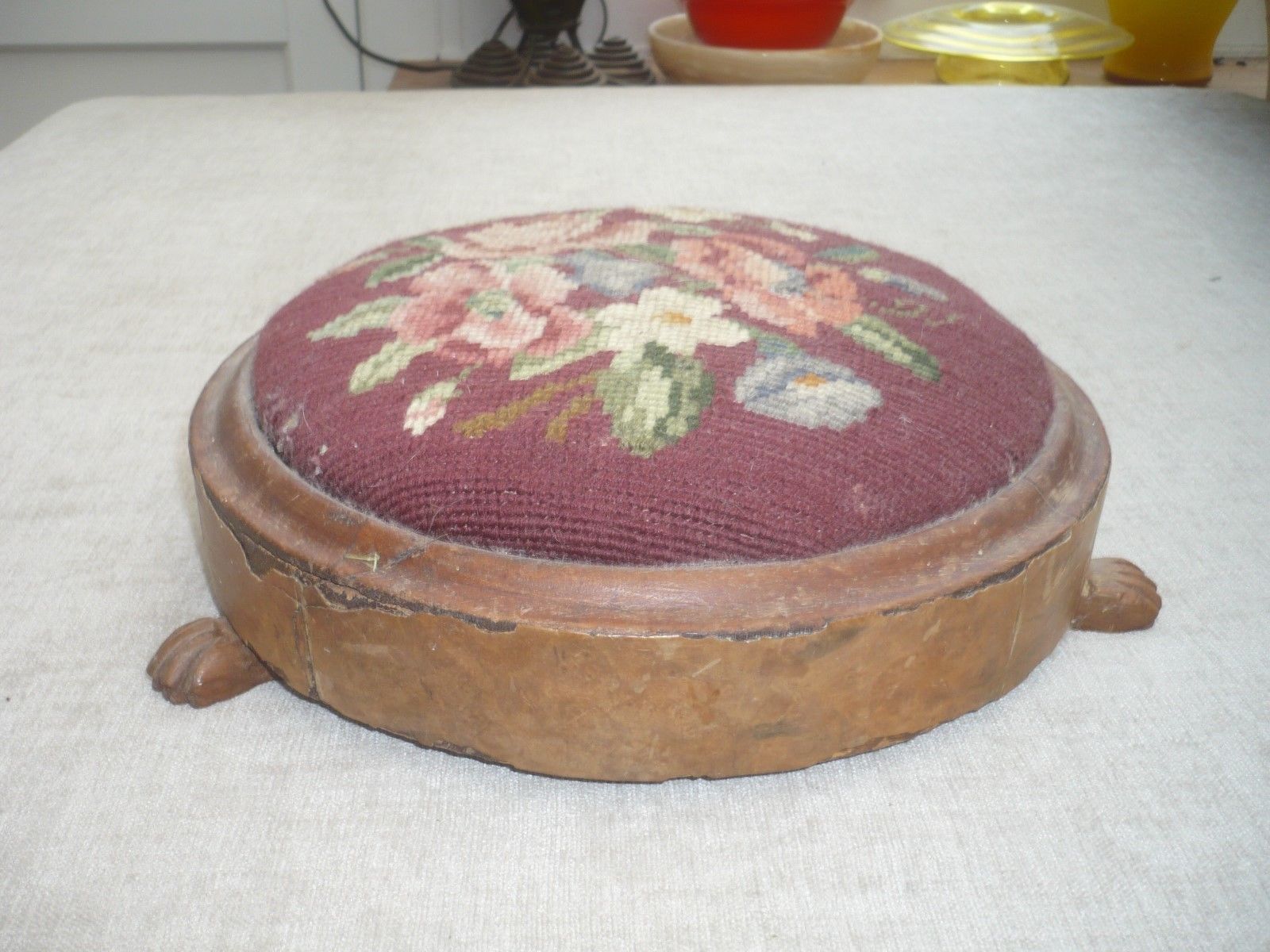 Title (ebay affiliate link): Antique quality tapestry circular footstool wooden paw feet Decorators Piece