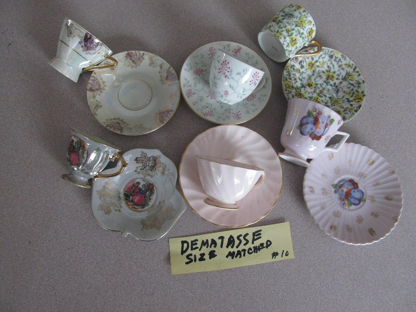 6 FANCY VINTAGE TEA CUPS/SAUCERS,BONE CHINA,DEMATASSE SIZE,MEISSEN,TUSCAN,SONSCO