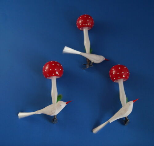 Title (ebay affiliate link): 3 BLOWN GLASS MUSHROOMS WITH BIRD - Fly Agaric - no reserve auction (# 10375)
