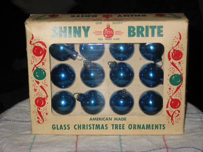 12 BLUE,1" VINTAGE SHINY BRITE ORNAMENTS W/BOX