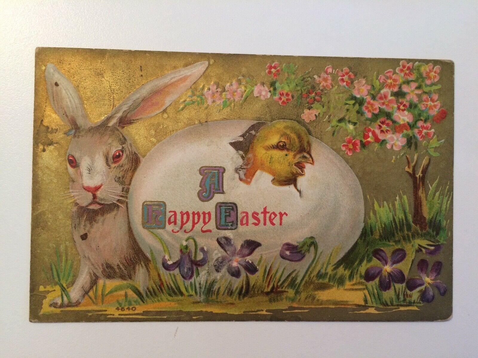 Title (ebay affiliate link): 1916 EASTER POSTCARD EMBOSSED #4640 BUNNY RABBIT CHICK TREE FLOWERS MICHIGAN