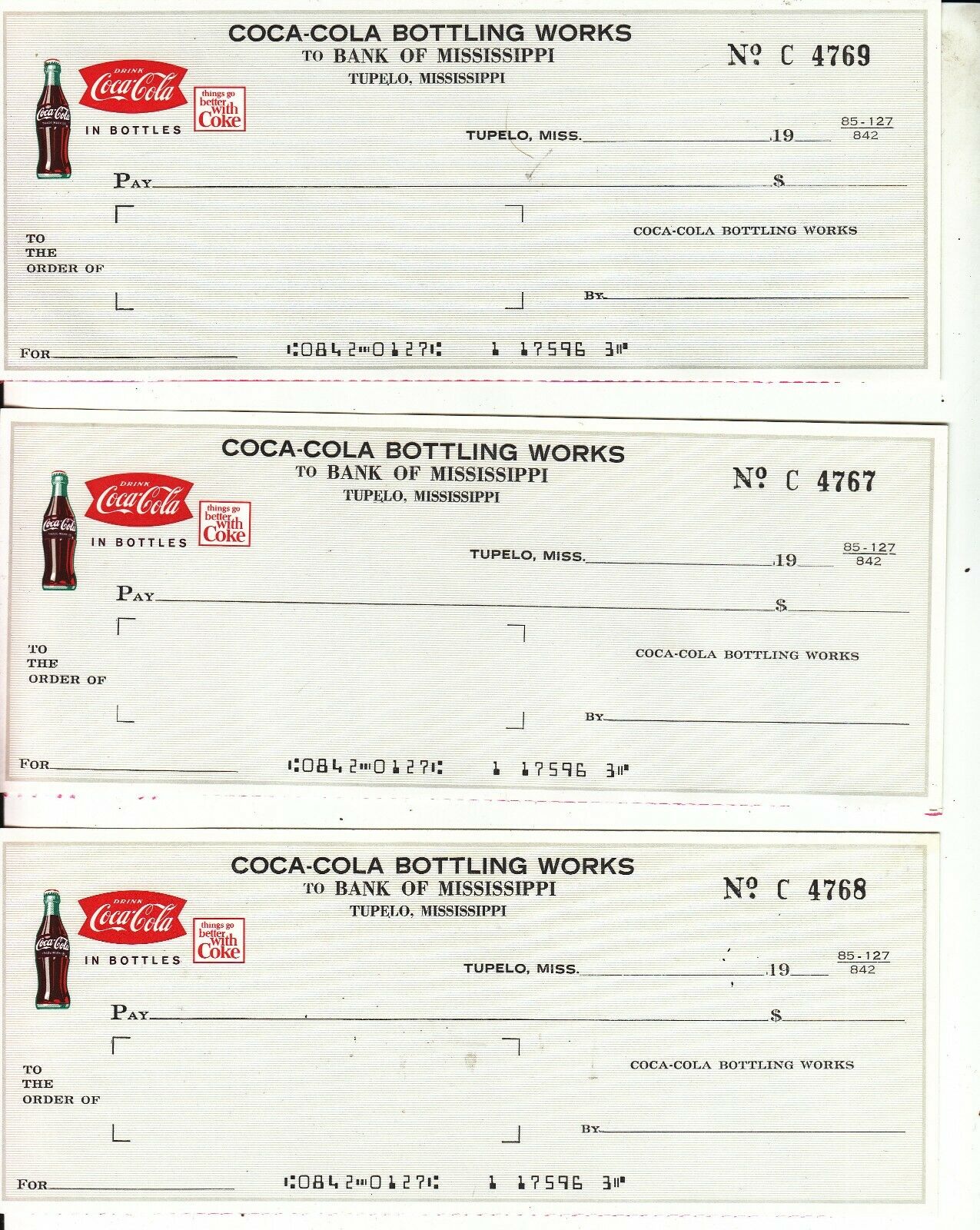 COCA-COLA BOTTLING WORKS TUPELO MISSISSIPPI CHECKS 3 UNUSED