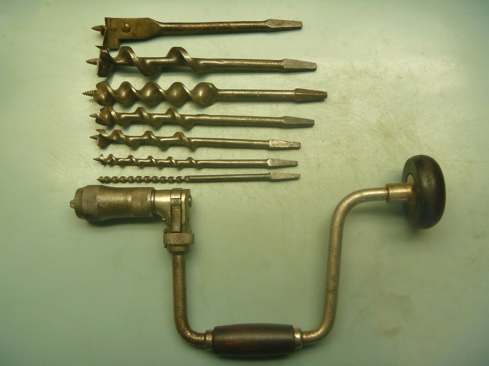 ANTIQUE OLD VINTAGE WOODWORKING TOOLS BIT BRACE MILLERS FALLS W/ AUGERS